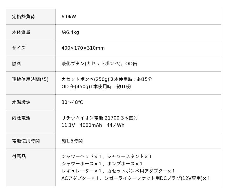 *5:環境温度25℃/水温16℃時。ガスの特性上、使用を続けているうちにカセットボンベの温度が低下し能力が落ちますが、連続使用時間はカセットボンベ3本で約15分・OD⽸1本で約10分です。連続使用時間は環境により変化する可能性があります。カセットボンベは室温などで温め直すことで再度ご使用いただけます。