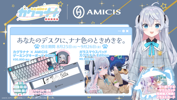 Game & Co.が展開するブランド「AMICIS (アミシス)」は、バーチャルアーティスト「カグラナナ」との限定コラボデバイス「オリジナルゲーミングキーボード」と「ガラスマウスパッド」を8月25日から9月26日23:59までの期間限定で受注販売する。価格は、ゲーミングキーボード「カグラナナ × AMICIS ゲーミングキーボード80HE」が30,800円、ガラスマウスパッド「カグラナナEdition」が9,900円。