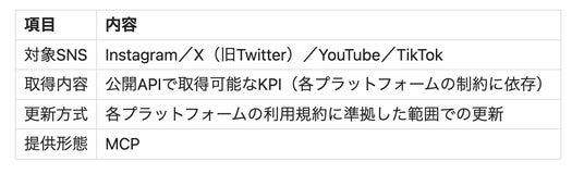 日本語による滑らかな対話でSNSマーケを前に進められる。Instagram/X/YouTube/TikTokの利用可能データをLLM経由で適切に活用