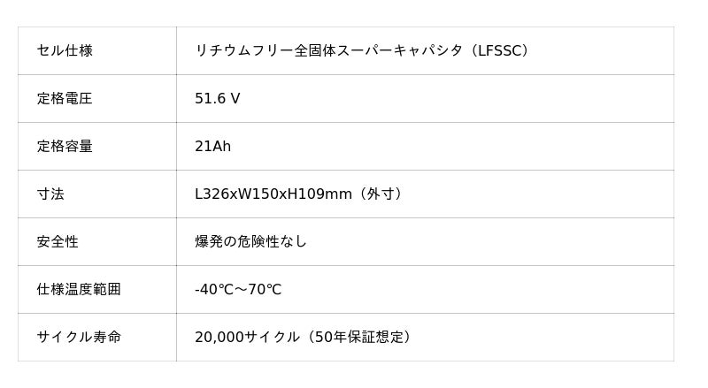 【リチウムフリー全固体スーパーキャパシタ(LFSSC)試作モデル "2075"の主な仕様】