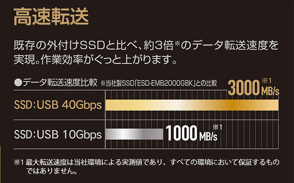 今回登場したポータブルSSDの最大の特徴は、USB 40Gbps(USB4 Gen2×2)に対応している点である。読み込み最大3,000MB/s、書き込み最大2,700MB/sという速度を誇り、大容量データのやり取りをスムーズに行える。