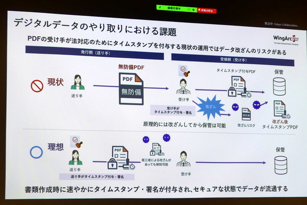 企業での文書のデジタル化と電子帳簿保存法の施行にともない、タイムスタンプのニーズは高まっている。しかし、今まではタイムスタンプのないいわゆる「無防備PDF」に受領側でタイムスタンプを付与するのが一般的だった。しかし、原理的には改ざんしてから保存することも可能。本来はPDF作成時にタイムスタンプと署名が付与され、送り手からセキュアな状態でデータが流通させるのが理想だ。
