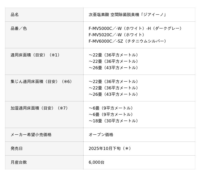 パナソニック株式会社(以下、パナソニック)は、B4サイズの設置面積で適用床面積(※1)22畳を実現した次亜塩素酸 空間除菌脱臭機「ジアイーノ」F-MV5000Cを2025年10月下旬(*)より発売します。