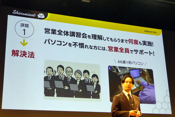 アプリのプロトタイプはできた。ただ、現場で運用を始めるにあたっては4つの課題を解決する必要があった。1つ目の課題は「営業にkintoneを使える環境がなかったこと」だ。「当時、営業には個人専用のパソコンがなく、操作に不慣れな年配の方もいました」と段畠氏は語る。