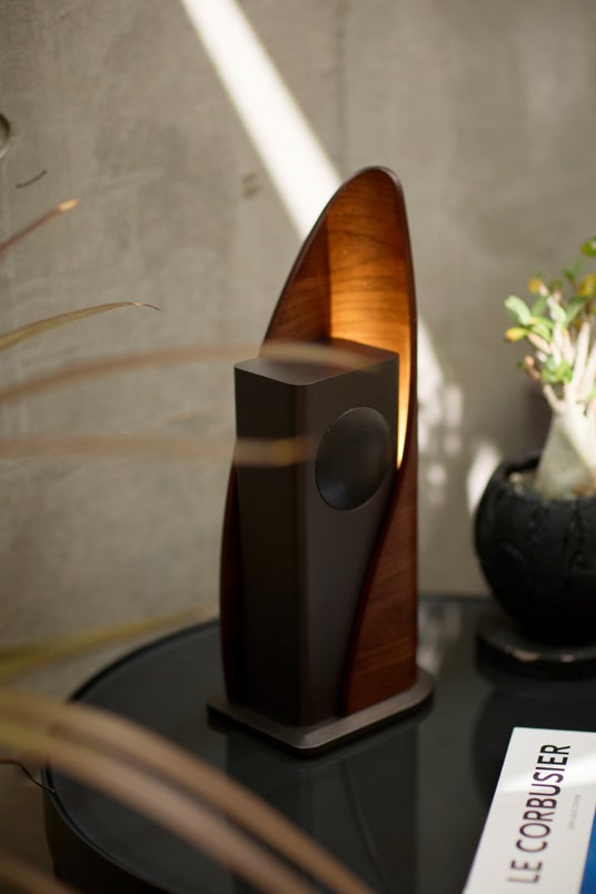 帆船を思わせる優美な非対称フォルムと曲線を描くプライウッドが印象的な間接照明付きポータブルBluetoothスピーカー。
