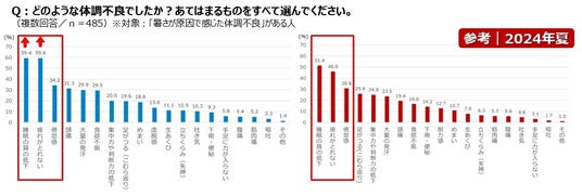 経験した体調不良の症状のTOP3は、2024年夏の全国調査(※1)と同じ傾向ですが、熱あたりの初期症状とも言える「睡眠の質の低下」、「疲れがとれない」の経験率がより高くなっていることがうかがえます。