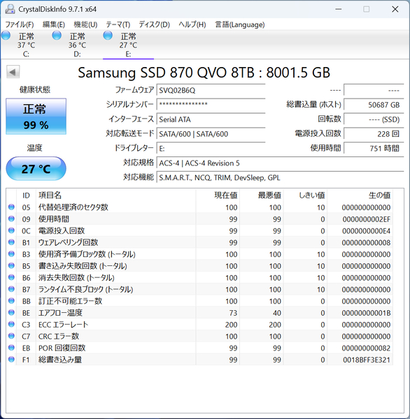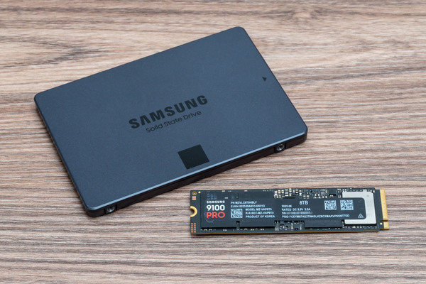 さらに実使用シーンでの比較用には、最大転送速度が600MB/秒となるSATA3接続の2.5インチSSDになるが、SSD最大容量の8TBを実現した。ロングセラーモデルのSamsung「870 QVO 8TB」を用意してみた。9100 PROとは、パフォーマンスに約25倍も差があるだけに、データコピーに要する時間の短縮には大いに期待できる。