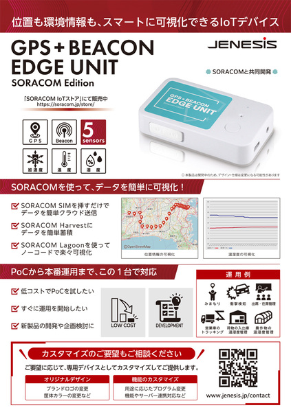 IoTの開発は企画・設計から量産、出荷まで超えなければいけない壁が多く、投資の大きさや環境作りといった点でプロジェクトが止まってしまうケースも多い。そこでそうした企業のチャレンジを応援し、新規プロジェクトを開拓しやすくするために、IoTデバイスのODMを手掛けているJENESISがソラコムと共同で、汎用型の「GPSマルチユニット SORACOM Edition」を開発した。