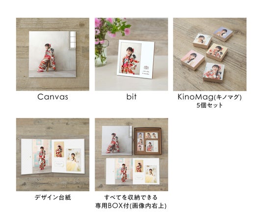 Kibacoは、写真館で撮影した写真をひとつの専用ボックスにまとめて保存・贈ることができる商品です。壁に掛けられる写真パネル(キャンバス)や小型のフォトフレーム、写真付マグネット、厚紙のしっかりした写真台紙など、写真をさまざまなかたちで楽しめるアイテムを、温かみのある質感の専用ボックスに収めました。七五三や誕生日など、節目の写真を立体的に記録・保存できる点が特長です。アルバムでもデータでもない、新しい記録の残し方としてご祖父母やご親族への贈り物にも適しています