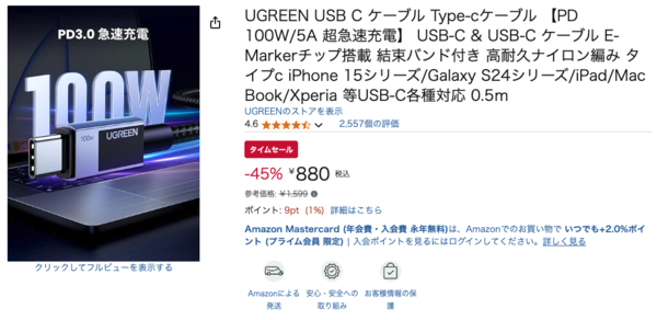 UGREEN「USB-C & USB-Cケーブル(PD 100W/5A対応)」が、今ならAmazonタイムセールにて特別価格880円で購入可能です。なんと45%オフという大幅割引が実施されています。