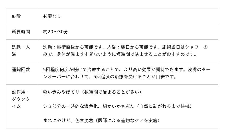 照射中は「輪ゴムで軽く弾かれるような刺激」がありますが、麻酔なしで受けられる程度です。施術時間は全顔で約20~30分。1回で顔全体のトーンアップを実感できる方も多いです。