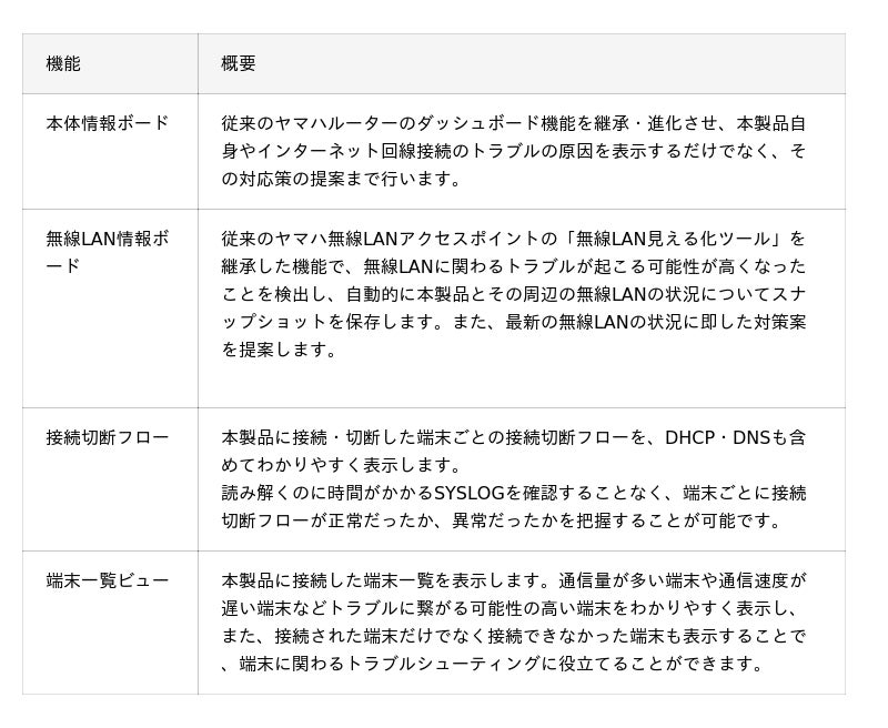 また、長年の実績を持つヤマハの法人向けルーターや無線LANアクセスポイントと同等の評価基準をクリアしており、高品質なハードウェアと長期運用に耐える信頼性を備えています。