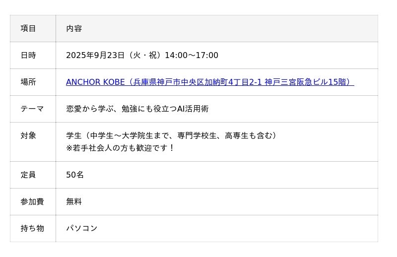 そのキックオフとして、2025年9月23日(火・祝)14:00~17:00、ANCHOR KOBEにて第1回イベント『恋愛から学ぶ、勉強にも役立つAI活用術』を開催し、参加者を募集します。