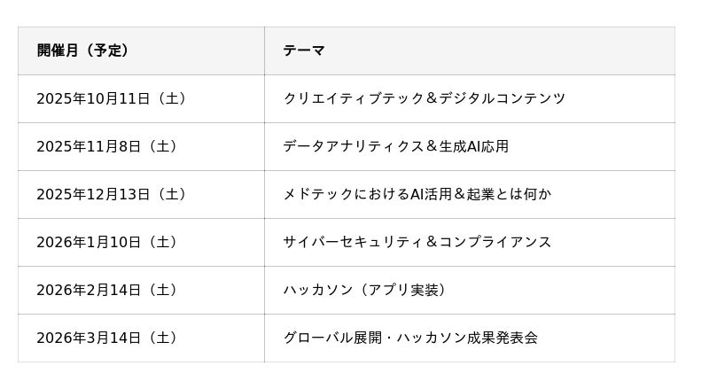 - 毎回テーマが変わる学びの場生成AI、データ分析、サイバーセキュリティ、クリエイティブテックなど、多様なテーマを設定。自分の興味や進路に合わせて参加できます。
