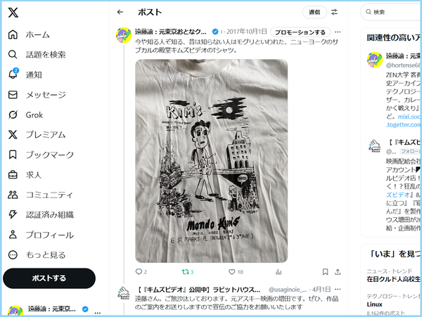 私の2017年のポストというのが、次の写真のポストで「今や知る人ぞ知る、昔は知らない人はモグリといわれた、ニューヨークのサブカルの殿堂キムズビデオのTシャツ。」と書かれていて、鉄人28号の金田正太郎くん(大友克洋原作の漫画・アニメ映画作品『AKIRA』の主人公ではないと思う)という感じでリモコンを持って歩いている少年が描かれている。