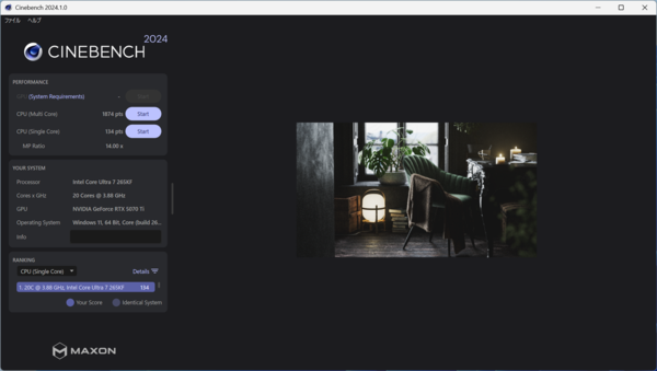 結果はMulti Coreが1874pts、Single Coreが134ptsだった。試用機材のCPUはCore Ultra 7 265KのGPU機能を省いたCore Ultra 7 265KF。Core Ultra 7 265Kの過去データを見てみると、Single Coreはほぼ同じだが、Multi Coreは2000ptsを超えているものもあるため、若干見劣りする。