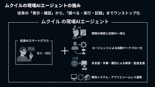 株式会社ムクイル(所在地:東京都墨田区、代表取締役:入江龍雅)は、製造業をはじめとする現場で深刻化している「情報アクセスの非効率」「記録負担の増大」という課題を解決するため、スマートグラスAIソリューションに生成AIを統合した新機能『現場AIエージェント』の提供を開始しました。