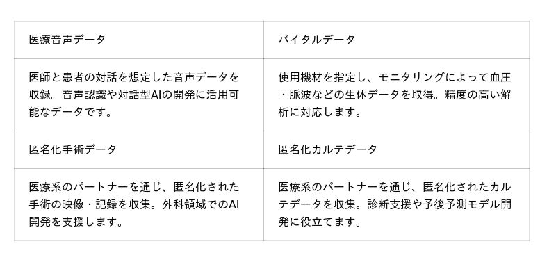 音声・テキスト・画像などの権利処理済みAI学習データを、複数のデータパートナーの協力のもと一元的に管理・提供します。下記のような医療分野におけるAI開発に必要な多様なデータを安全かつ効率的に収集可能です。