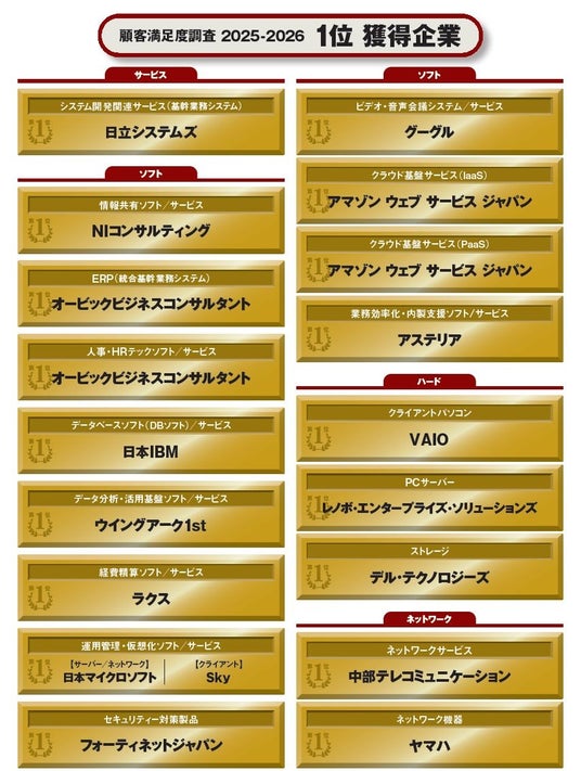 株式会社日経BP(本社:東京都港区、社長CEO:井口哲也)は2025年8月28日、「ビジネスを推進するIT」をテーマとする総合情報誌「日経コンピュータ」が実施したIT分野の製品やサービスを提供するITベンダーに対する満足度の調査である「第30回 顧客満足度調査」の結果を発表した。