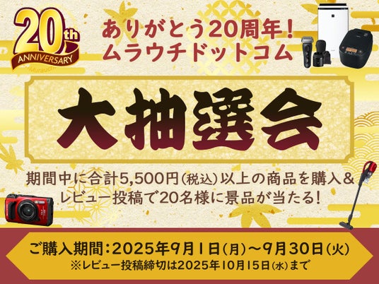 2025年9月1日 (月) ~2025年9月30日 (火) の期間、murauchi.com本店にて合計5,500円 (税込) 以上の商品をご購入いただき、商品レビューを投稿してくださった方の中から 20名様に、景品 (※) が当たる抽選会を開催します。