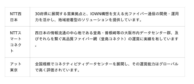 NTT西日本株式会社(本社:大阪府大阪市、代表取締役社長:北村 亮太、以下「NTT西日本」)、NTTスマートコネクト株式会社(本社:大阪府大阪市、代表取締役社長:宮奥 健人、以下「NTTスマートコネクト」)、および株式会社アット東京(本社:東京都江東区、代表取締役社長:泉田 達也、以下「アット東京」)は、西日本エリアにおける通信ネットワークやデータセンター等の次世代デジタルインフラの整備について、3社共同での検討を開始します。