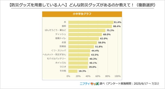 また、72.5%の小中学生は、普段から何かしらの防災グッズを用意していることがわかりました。「水」と「食料」のほか、「ばんそうこう・薬など」「ティッシュ」「簡易トイレ」といったヘルスケア用品も上位でした。