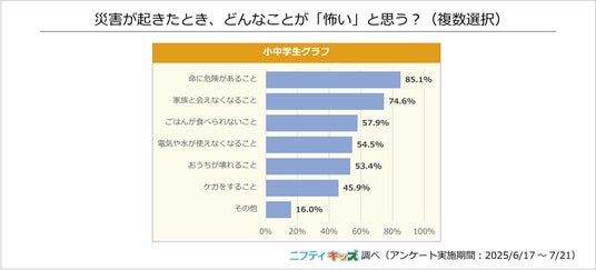 なお、小中学生が1番不安を感じる自然災害は、「地震」が最も多く、続いて「津波」でした。災害を経験したことのある人からは、「電気・水道が使えない」「コンビニの商品が売り切れる」「ネットがつながらず家族と連絡が取れない」といった経験談が寄せられました。