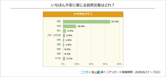「地震」と回答した小中学生が67.0%と最も多く、続いて「津波」に18.6%の票が集まりました。日本は地震や津波の影響を受けてきた国だからこそ、普段から危険性を意識しやすいのかもしれません。