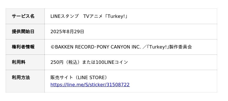 株式会社日テレWands(本社:東京都港区、代表取締役社長執行役員 角田 洋子、以下、日テレWands)は、LINEヤフー株式会社が運営するコミュニケーションアプリ「LINE」内のスタンプショップとLINEの公式オンラインストアLINE STOREにて、TVアニメ「Turkey!」初のLINEクリエイターズスタンプの配信を開始いたしました。