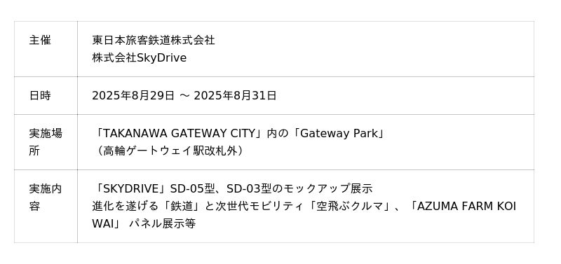 本イベントは、2025年8月29日~8月31日の3日間の開催で、JR東日本の「鉄道」とSkyDriveの次世代モビリティ「空飛ぶクルマ」が融合し、未来の移動体験をテーマにした先進的なコンテンツを展示します。両社の創造性に満ちた取り組みと、陸空を自由かつシームレスに移動できる未来のビジョンを来場者の皆さまにご体感いただけます。革新的な技術と発想が織りなす、次世代のモビリティの世界をぜひお楽しみください。