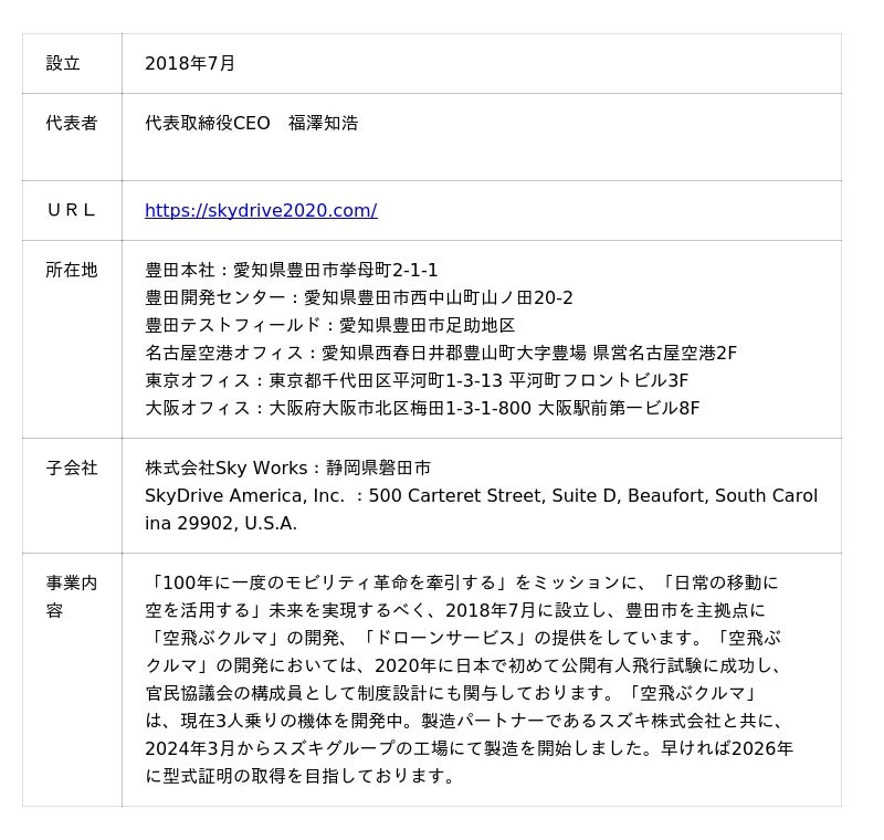 また、両社の業務連携を加速する一環として、今回空飛ぶクルマの商用機「SKYDRIVE」1機のプレオーダーを合意したことをお知らせいたします。今後も、人と地域、空と陸をつなぐ未来の価値創造に向けて、挑戦を続けていきます。