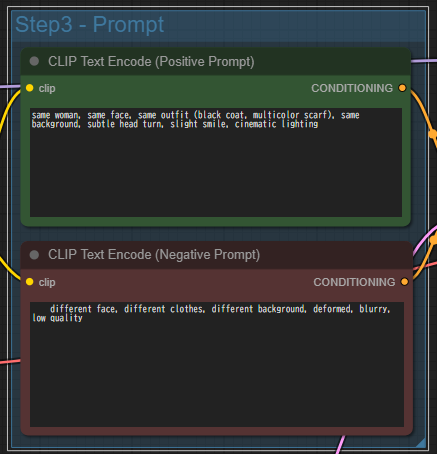プロンプトも見直し、元画像と「同じ女性」「同じ顔」「同じ服装」「同じ背景」で描いてと強調、さらにネガティブプロンプトに「違う顔」「違う衣装」「違う背景」と思いつく限りの条件を入れてみた。