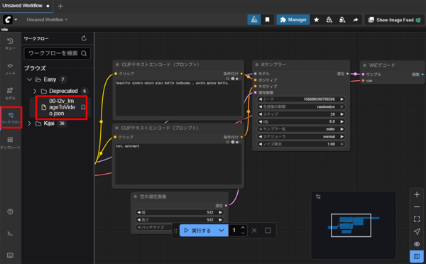 初期状態ではデフォルトのワークフローが表示されているので、左側サイドバーから「ワークフロー」を開き「Easy/00_I2V_ImageToVideo.json」をダブルクリックで実行。