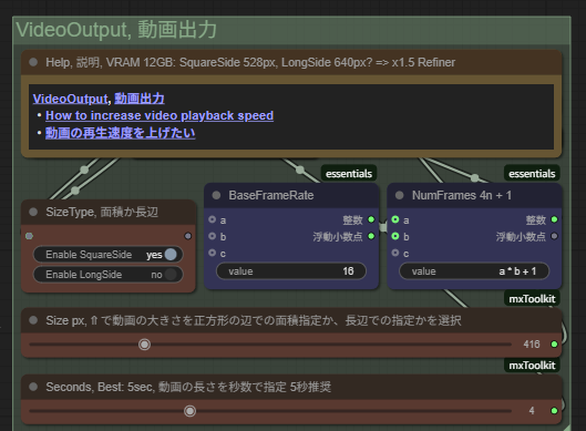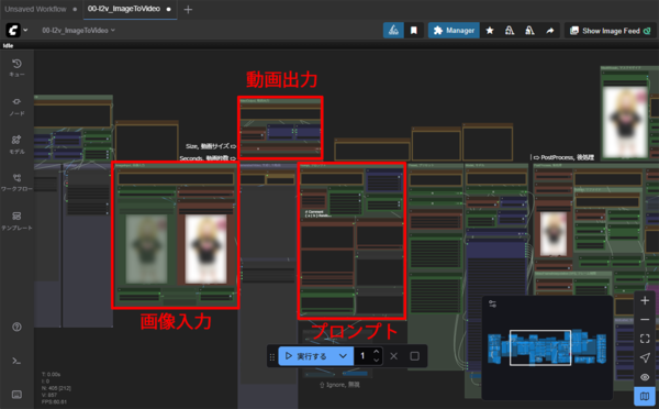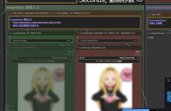 巨大なワークフローが表示されるが、今回利用するのは「画像入力」「動画出力」「プロンプト」の3箇所だけなので安心してほしい。