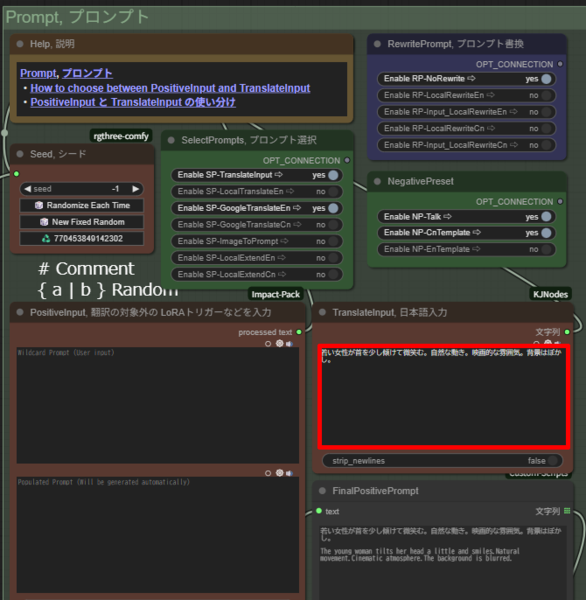 最後はプロンプト、「TranslateInput」ノードに日本語で入力すると自動的に英語に翻訳してくれる。下記のプロンプトを入力して生成開始だ。