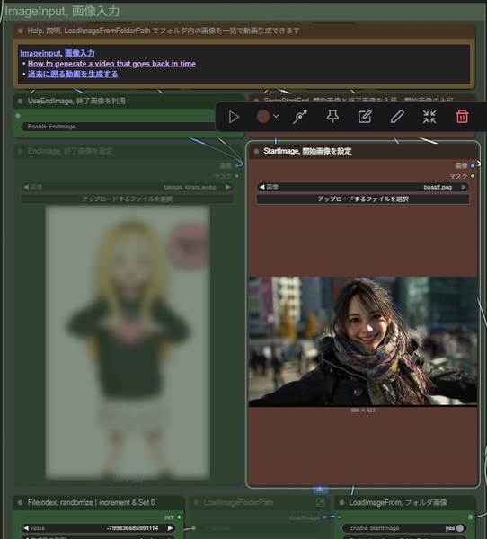「StartImage、開始画像を設定」ノードにあらかじめ用意しておいた開始画像をドラッグ&ドロップでロードする。なお、このブロックで終了画像を設定することも可能だ。その場合、Enable EndImageをオンにしておく必要がある。