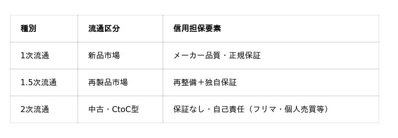 新品(1次流通)から、中古・CtoC(2次流通)までの間には、「品質と信用の再設計」を通じてもう一度“製品”として市場に送り出す領域──すなわち「1.5次流通」が成り立つ余地があります。