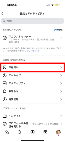 保存した投稿は、メニュー→「保存済み」をタップすることで閲覧可能だ。
