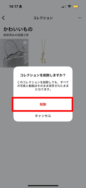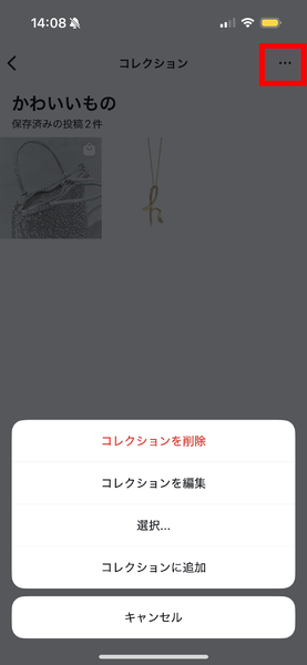 コレクションは、右上のマーク→「コレクションを削除」で削除、「コレクションを編集」でカバー写真や名前の編集ができる。「選択」でコレクション内の画像ごとに選択して削除、移動などが可能。さらに「コレクションに追加」で、コレクションに新規で追加したい画像を選択すれば追加可能となる。
