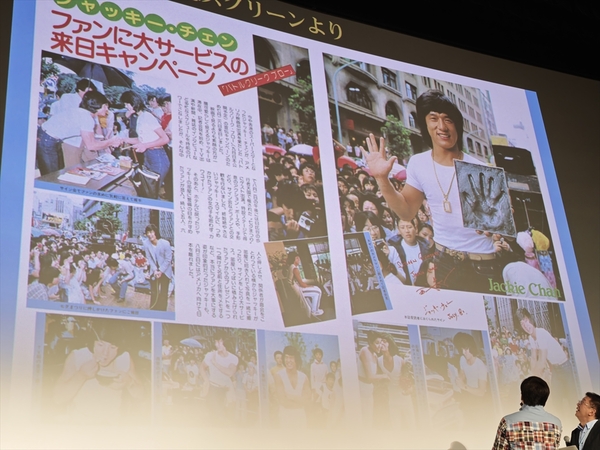 さらに、日本のファンにとっては忘れられない特別な思い出も披露されました。ジャッキーは俳優であり、歌手でもあります。レコードデビューは実は日本だったりします。現地にはそのレコードを持って来た熱心なファンもいました。その話の流れから、歌を披露してほしいとなり、迷ったジャッキーは得意の持ち歌である「TOKYO SATURDAY NIGHT」を唄いました。この歌は1985年に公開された泣けるジャッキー映画「ファーストミッション」のエンディングテーマで、作詞作曲は美樹克彦、歌詞は日本語です。もう40年前の歌ですが、日本で舞台挨拶をやるたびに唄うくらいジャッキーのお気に入りです。会場も手拍子で盛り上げました。