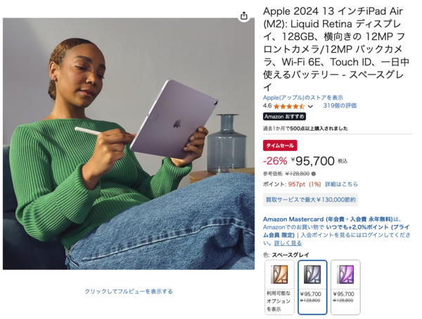Amazonは「タイムセール」にて、13インチiPad Air (M2) を販売中です。