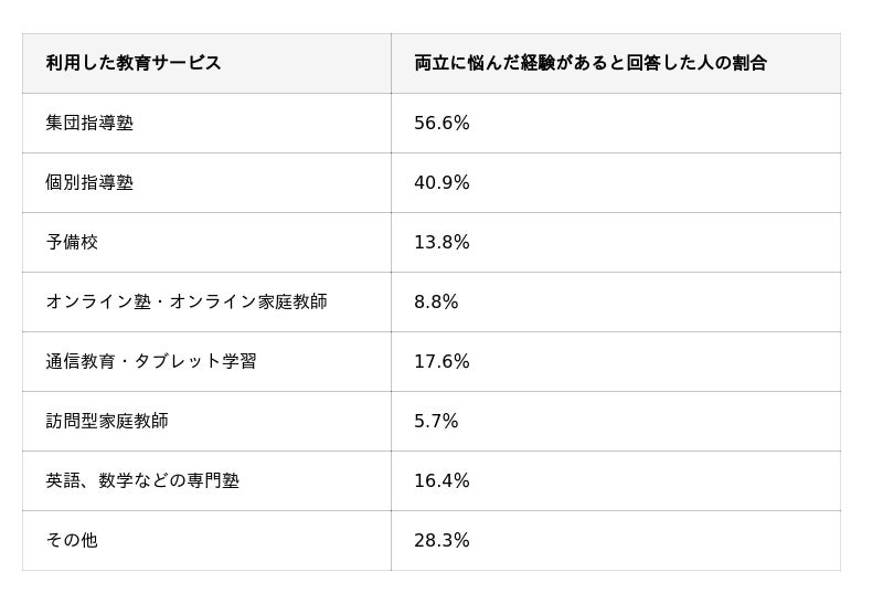 興味深いのは、利用した教育サービスの種類によって、「両立に悩んだ」との回答に差がある点です。利用した教育サービス別に、「両立に悩んだ経験がある」と回答した人の割合を、以下にまとめました。