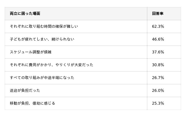 調査では、「部活や習い事と教育サービスの両立に悩んだ経験がある」と回答した保護者に、困った場面を具体的に尋ねました。主な回答項目と回答率は、以下のとおりです。
