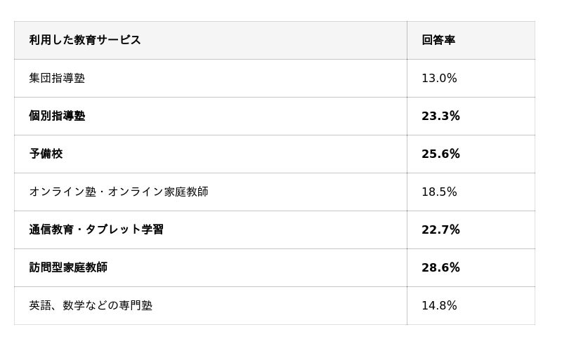※教育サービス:学習塾、大学受験予備校、映像授業塾、オンライン指導、家庭教師など