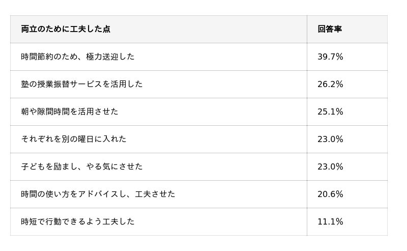 調査では、部活・習い事と教育サービスの両立に困った経験がある保護者に、両立を実現するためにどのような工夫を実施したか尋ねました。主な回答は、以下のとおりです。