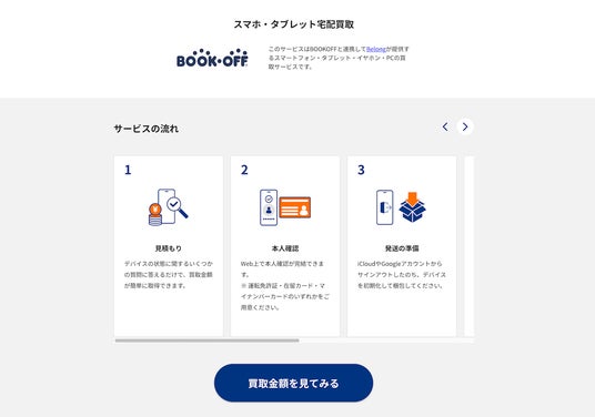 ブックオフが運営する「BOOKOFFサービスサイト」に、当社の個人向けスマートフォン買取サービス「スマホ・タブレット宅配買取」を提供します。これにより「BOOKOFFサービスサイト」における、スマートフォン・タブレット等に特化した簡単かつシンプルなオンライン買取体験を実現させ、「BOOKOFF」の店舗・公式オンラインストアでより柔軟にスマートフォン・タブレット等を売却できる環境を構築することで、「BOOKOFF」顧客の利便性向上に貢献してまいります。