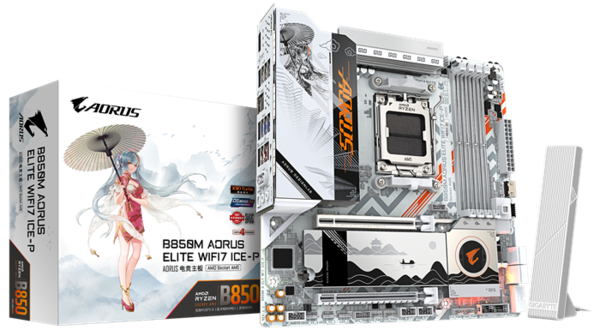 さらに注目すべきは、新キャラクター仕様のマザーボード「B850M AORUS ELITE WIFI7 ICE-P」の登場である。2025年後期の発売が予定されており、MicroATXモデルとして先進的な12+2+2フェーズ・デジタル電源設計を採用。安定した電力供給と高いパフォーマンスを実現する設計が大きな特徴となっている。