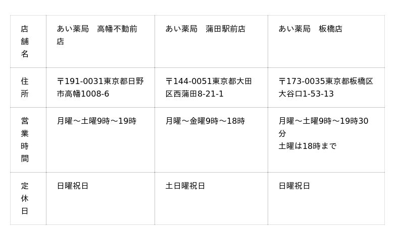 あい薬局は、地域に愛される薬局を目指し、高幡不動前店・板橋店・蒲田駅前店の3店舗を運営しています。
