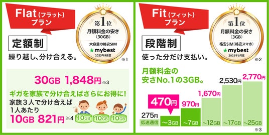 2025年6月にリニューアルされた「Flatプラン 30GB」(月額2,068円)は、データシェア機能にセット割を加えることで、業界最高水準※のコストパフォーマンス(No.1クラス)を実現しました。