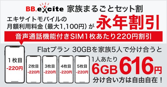 エキサイトモバイルの音声通話機能付きSIM1枚ごとに月額利用料金から220円を割引します。